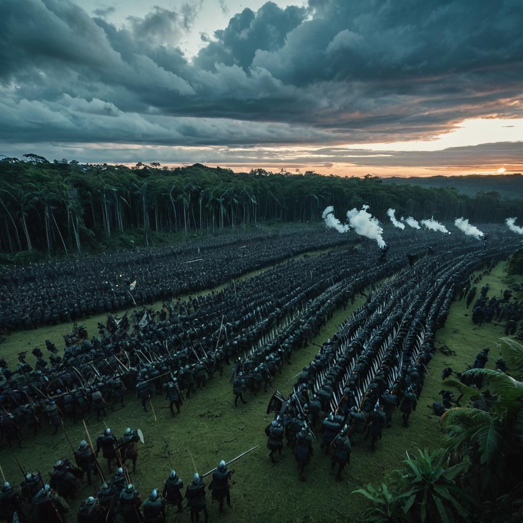 Twilight jungle encounter, shot with a wide lens from a height of 20 meters. Clear image. 4k, the plain in the foreground. large number of mystic shamans. The screen is distorted by the curvature of the lens. Fighting is happening everywhere. The armies line up and face each other. crane angles of armies beyond the horizon. dense canopy at dusk at sunset, with clouds and rising smoke.