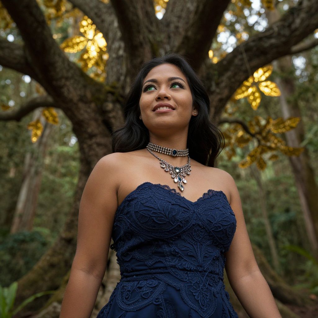 Hyperrealistically capture an enigmatic Melanesian woman in her mid-thirties with compassionate green eyes, long raven hair, and a captivating smile. Adorned in an elegant midnight blue gown featuring intricate lace detailing, she wears a striking choker necklace that sparkles as she moves. The portrait is taken from an unusual low angle, emphasizing her delicate features such as high cheekbones and a well-defined jawline. Standing before a mysterious ancient tree with glowing golden leaves in an ethereal forest clearing, her demeanor shifts between serenity and intrigue, evoking curiosity about her true nature amidst this surreal environment.