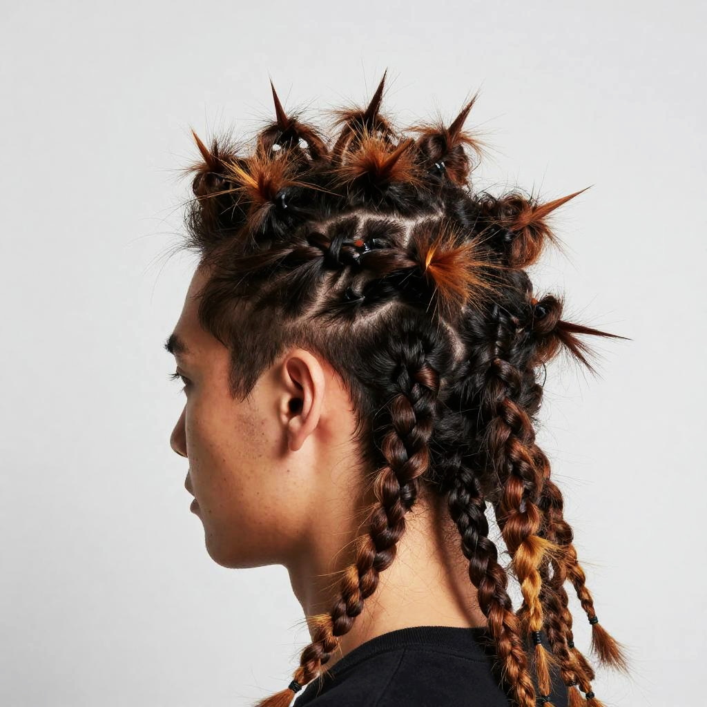 Creative studio shot of unconventional hairstyles combining dreadlocks, braids, and spikes, bold color palette, high fashion vibe, sharp focus, textured hair strands, artistic expression