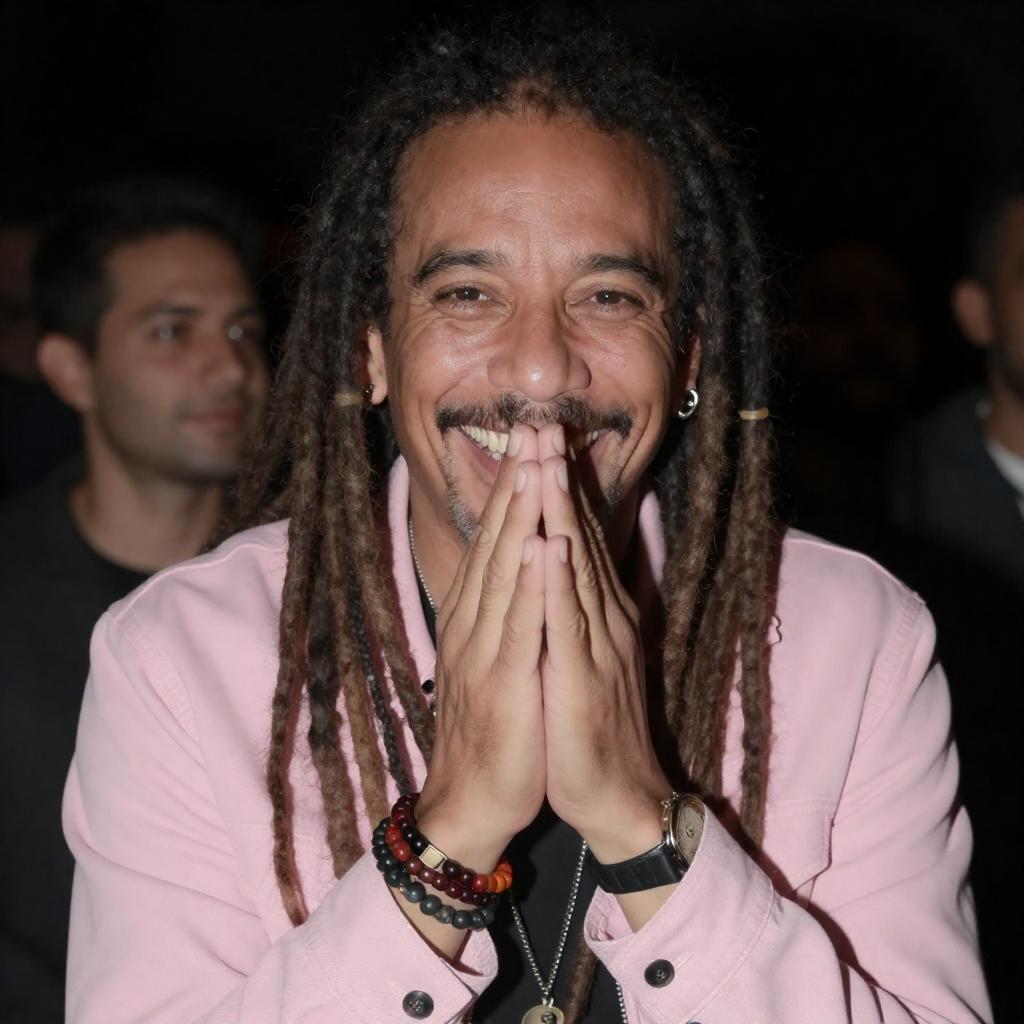 Photorealistic, sharp focus, raw photo, amateur vibe, 56-year-old Afro-Latinx non-binary person with salt-and-pepper dreadlocks pulled back, light moustache stubble, warm freckled skin and small silver pilot glasses, wearing well-worn vintage brown bomber jacket with embroidered travel and music patches over a faded navy-and-white striped rugby shirt, selfie at cozy urban rooftop garden with trailing ivy, potted succulents on rustic wooden shelves, string lights overhead, pastel sunset sky, and distant city skyline, dynamic pose, looking at viewer, face-centric composition, detailed skin pores and face texture, subtle goosebumps, natural freckles or stubble, handheld framing, taken with mobile camera, slight lens distortion, shallow depth of field, soft film grain, ambient glow, authentic imperfections, gentle vignetting, real background elements, candid atmosphere, realistic color grading, catchlights in eyes