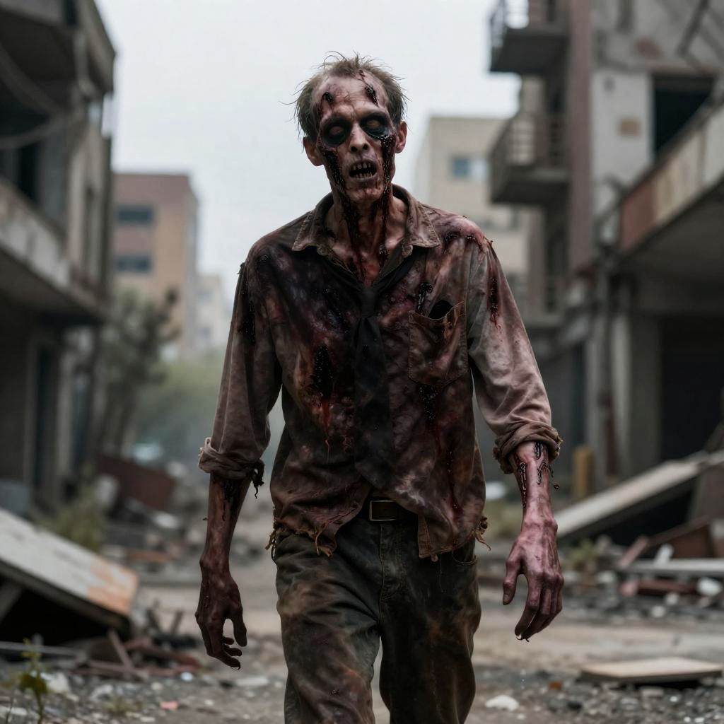 Realistic photo.ZOMBIE - A male zombie from horror stories. Features decaying flesh, wandering through a post-apocalyptic city background. Captured with a haunting yet beautiful aesthetic. realistic photo