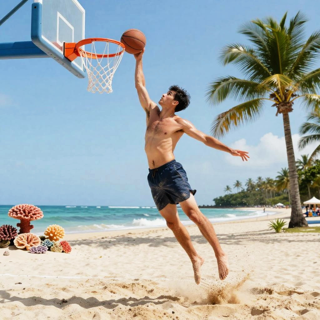Shrimp playing basketball in a sandy beach setting, tropical palms in background, action-packed moment with shrimp leaping for a slam dunk, colorful coral reef nearby, bright summer vibe