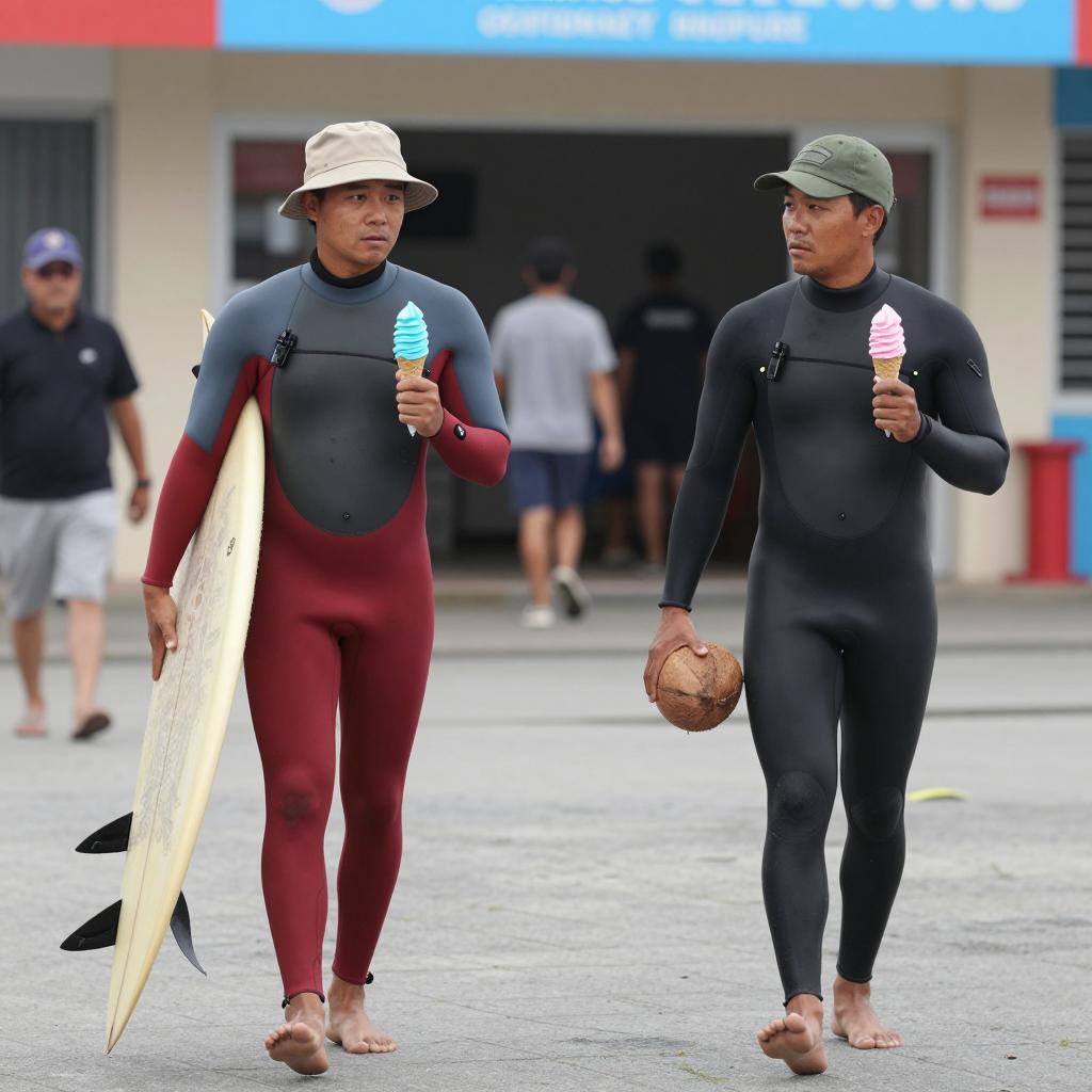 Photograph of two male surfers walking on a beach. Both have short black hair. Left surfer wears black and blue wetsuit, carries white surfboard with blue pattern. Right surfer wears black and purple wetsuit, holds red surfboard with . Background shows misty, blurry beach and rocky hill. They hold hands and look forward.