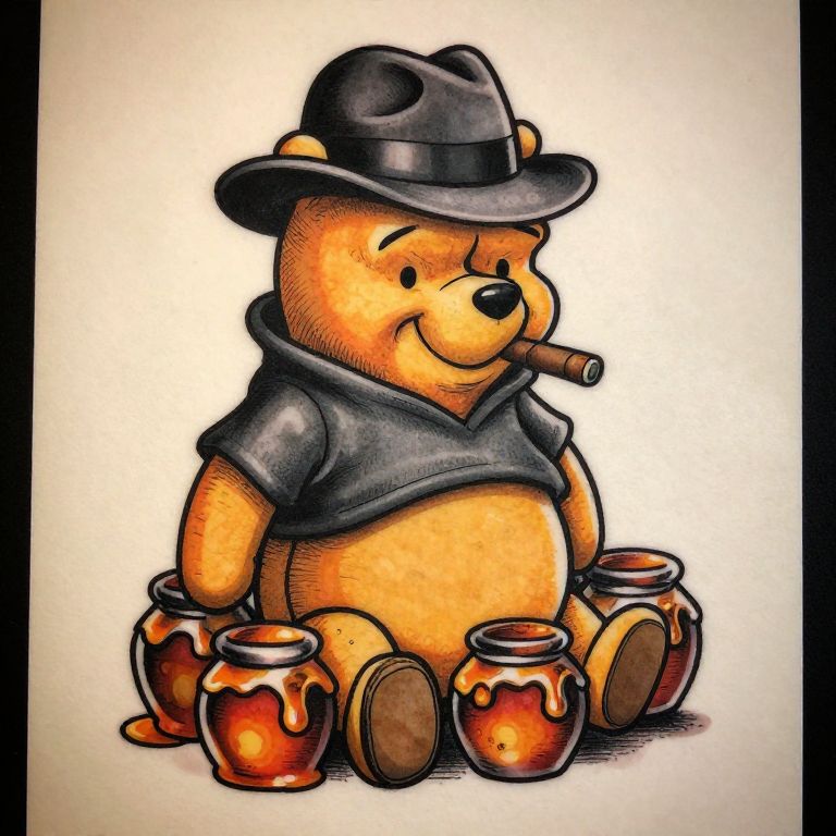 Tattoo design of gangster Winnie the Pooh, intense expression, fedora hat, cigar in mouth, sitting on a pile of honey pots, dark ink shading, street art vibe, intricate linework with bold outlines