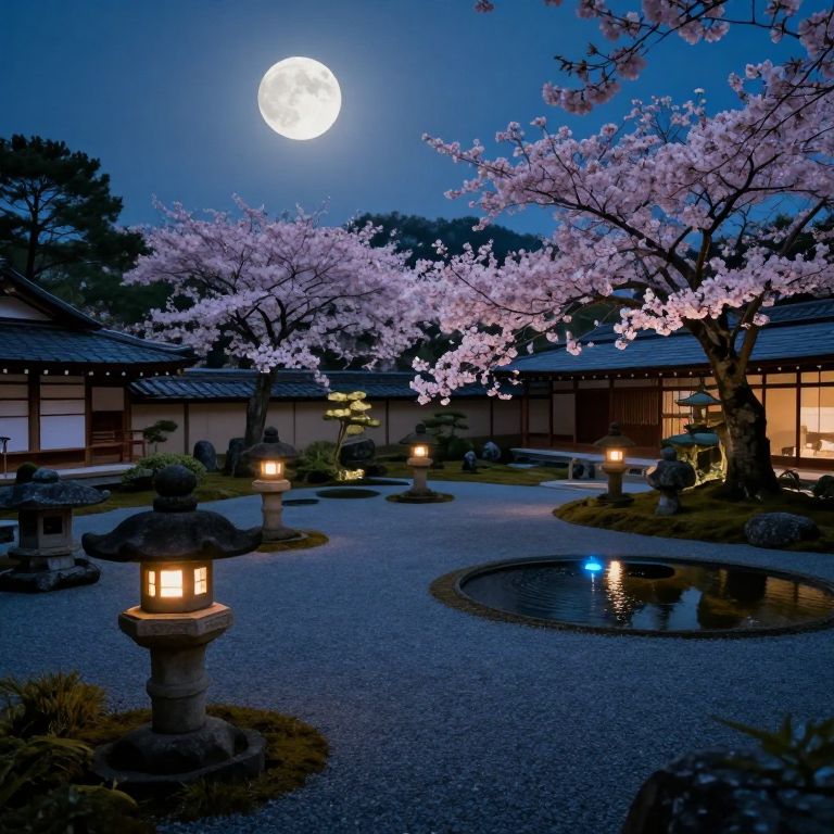 Photograph of a serene Japanese garden at night, illuminated by a full moon. Pink cherry blossom tree in the foreground, with soft pink petals against a deep blue sky. Stone lanterns with warm yellow lights are scattered across the gravel path, which curves around a small, reflective pond. Traditional Japanese wooden buildings with sliding doors are in the background, partially obscured by the tree. The scene is tranquil, with a sense of calm and beauty, enhanced by the moonlight and gentle glow of the lanterns.