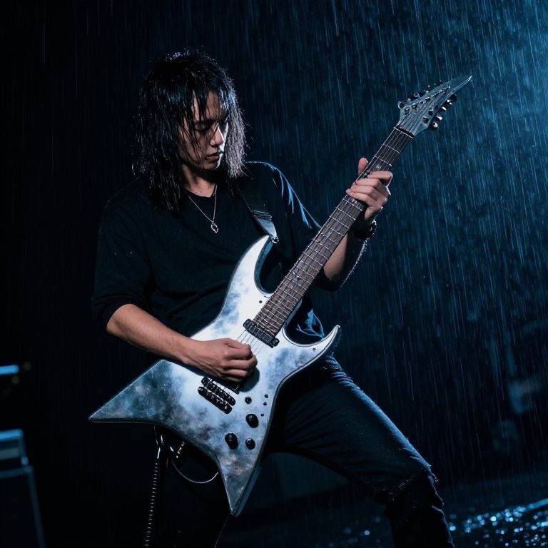Dissonance a photo of a metal guitar player under the night rain holding a futuristic flying V guitar,