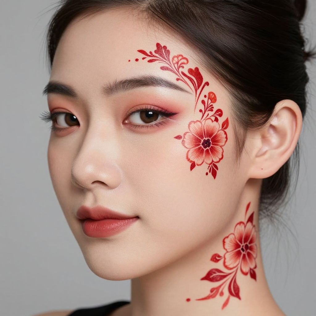 Woman showcasing vibrant cosmetic tattoos featuring intricate red floral designs above her right eye and extending onto her neck, complemented by bold makeup and a subtle smile.