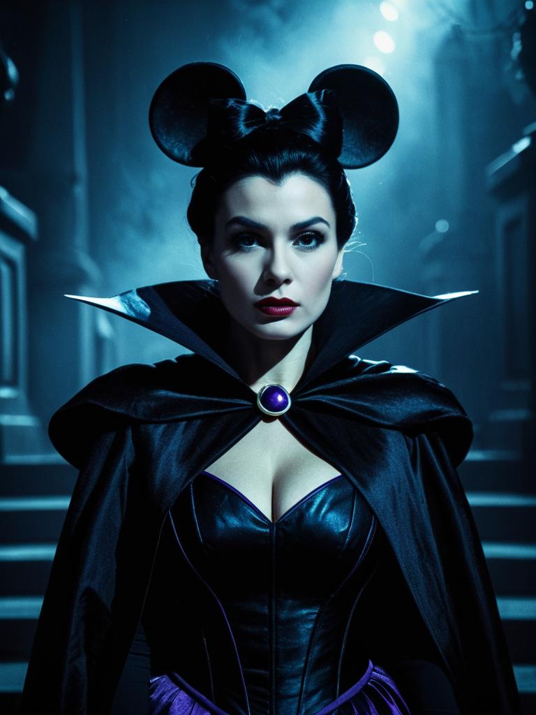 Woman in Disney Villain costume, cinematic portrait with moody lighting