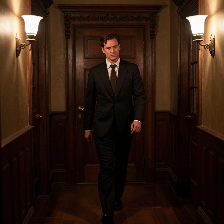 Photograph of a serious-looking man in a dark black suit, white dress shirt, and black tie, standing in a dimly lit, narrow hallway with dark wooden walls and door. The hallway is illuminated by two white wall sconces on either side, casting a warm, yellowish glow. The man has short, dark hair, and a medium build. He stands centrally, facing forward, with a slight frown, exuding an air of tension or contemplation. The wooden floor and detailed wooden paneling add a classic, somewhat ominous atmosphere to the scene.