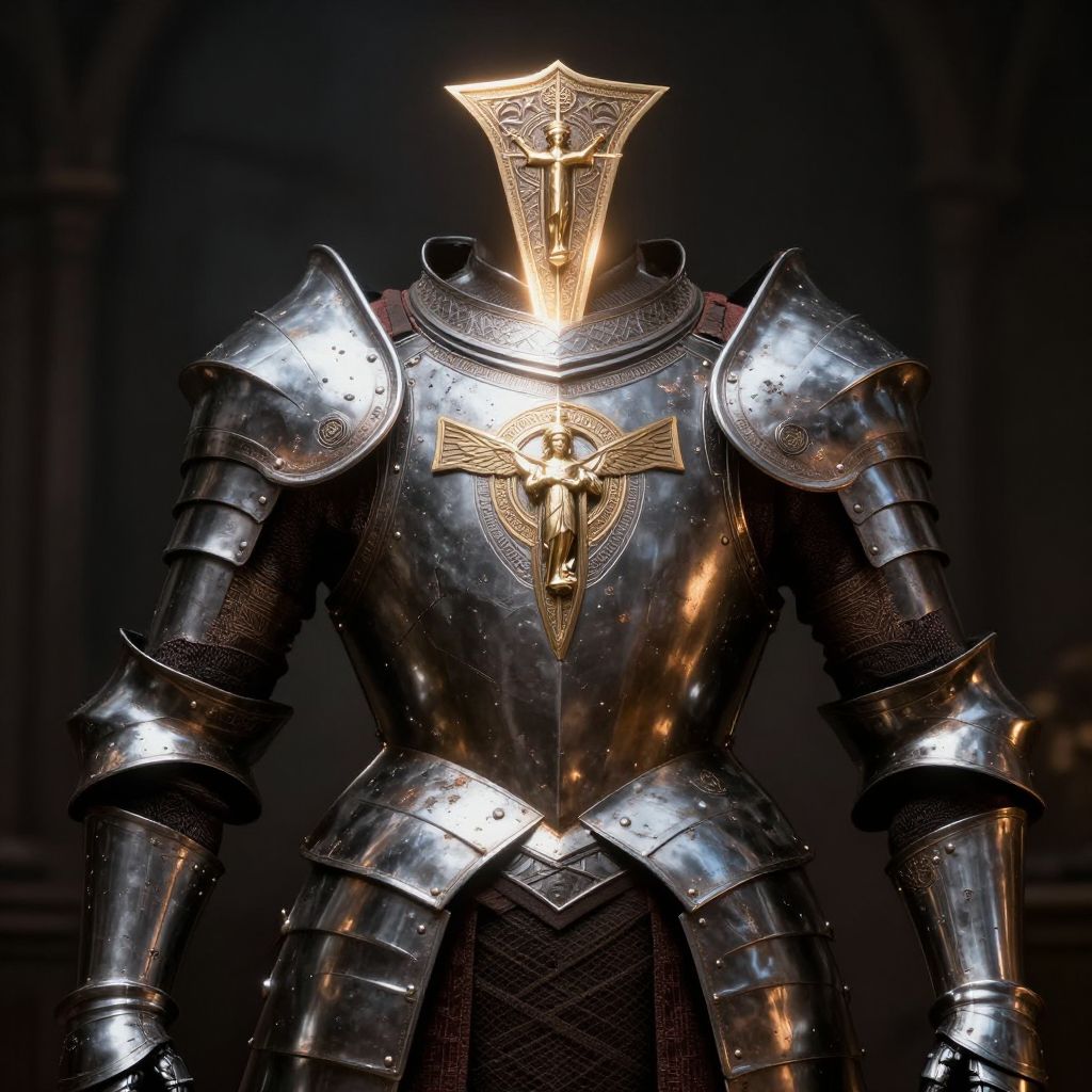 Holy crusader armor in a close-up shot showing intricate metalwork and religious symbols, worn and battle-scarred yet majestic, with a glowing aura suggesting divine protection, dark moody background contrasting with the shining armor, fantasy realism art style.