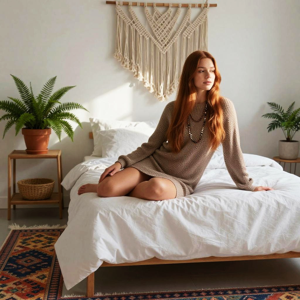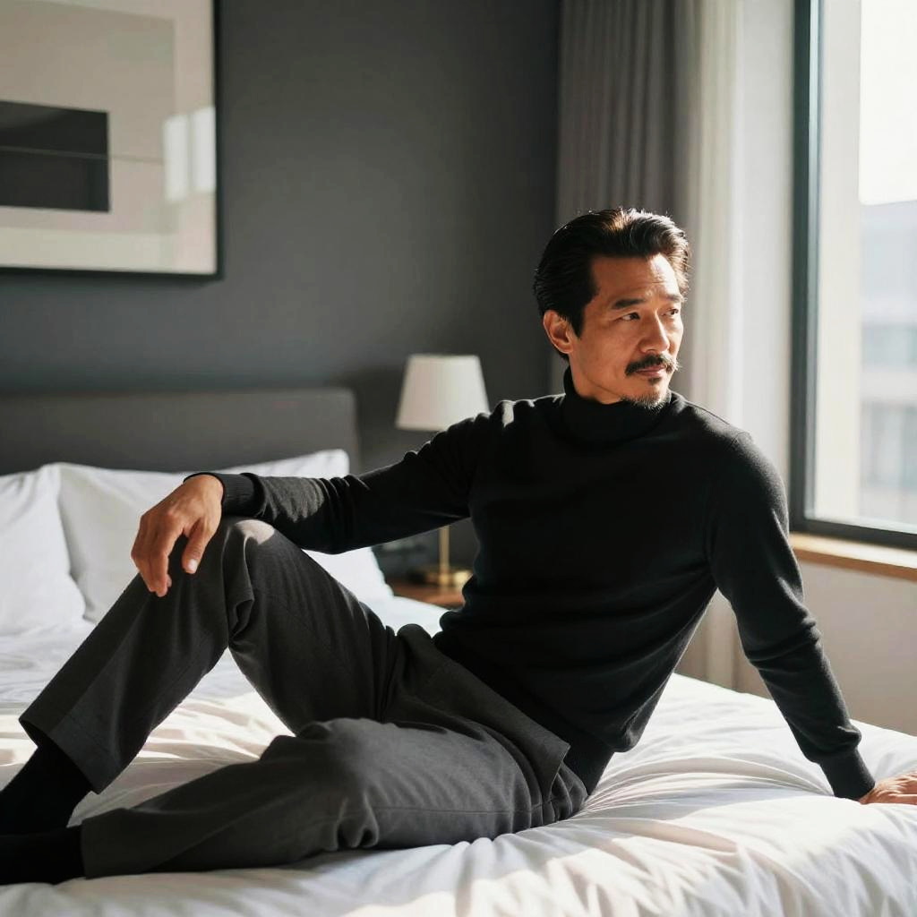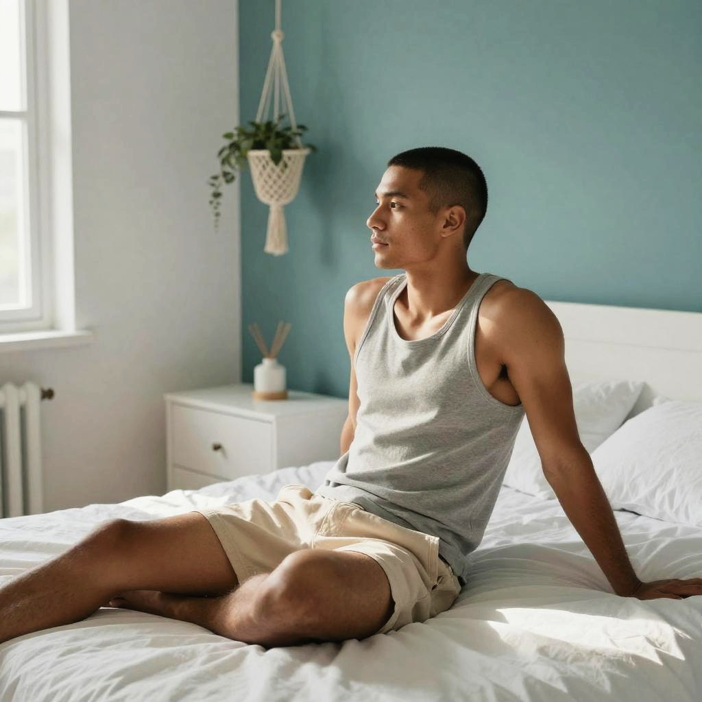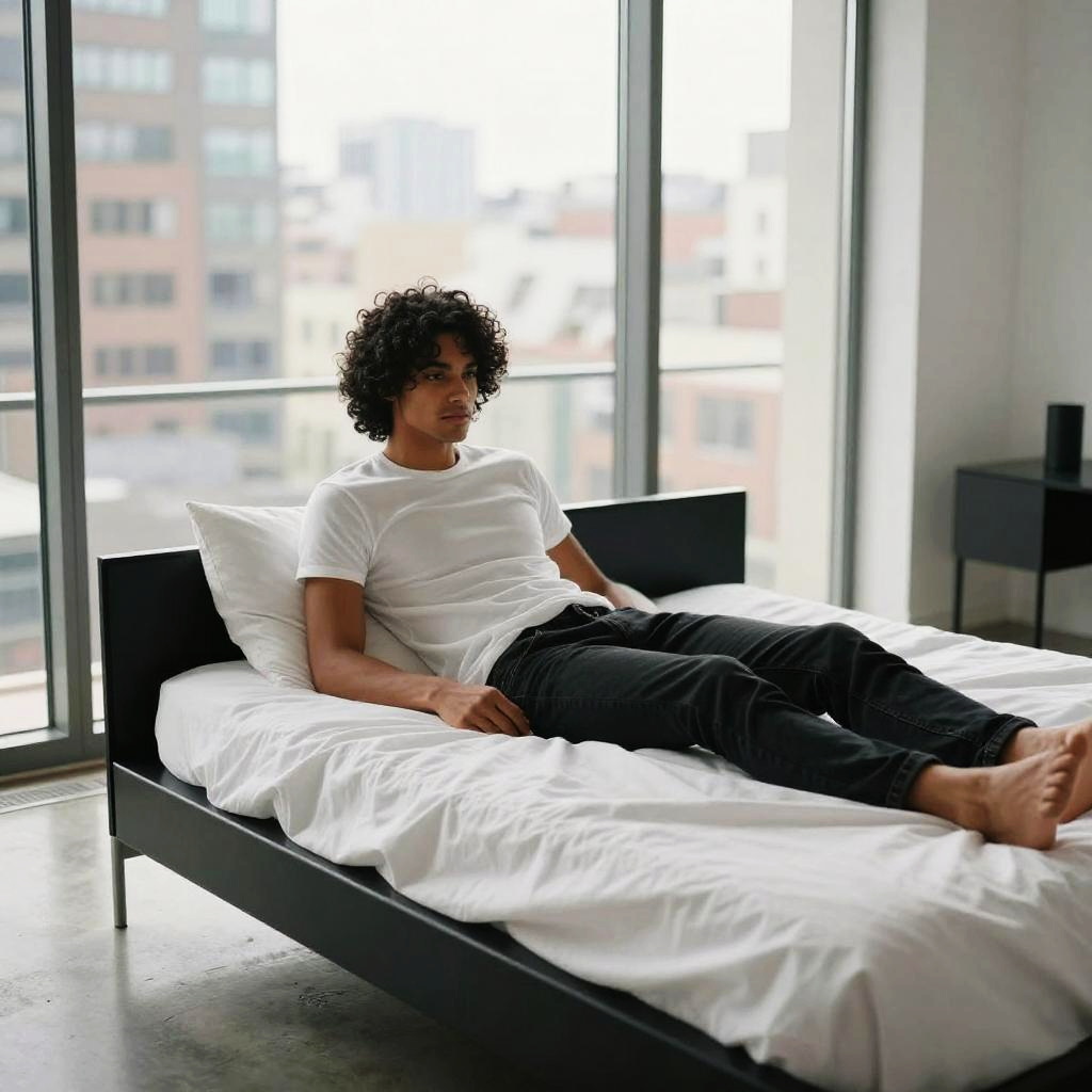 Photograph of an adult man with tousled light brown hair and clean-shaven face, relaxed on a neatly made bed in a minimalist bedroom with white walls, black metal bed frame, and a geometric patterned rug. Wearing navy blue button-up shirt and charcoal trousers. Natural window light brushes across the scene, gentle rim light in the hair, airy atmosphere, editorial lifestyle mood, soft color grading, subtle grain, serene expression, clean composition.