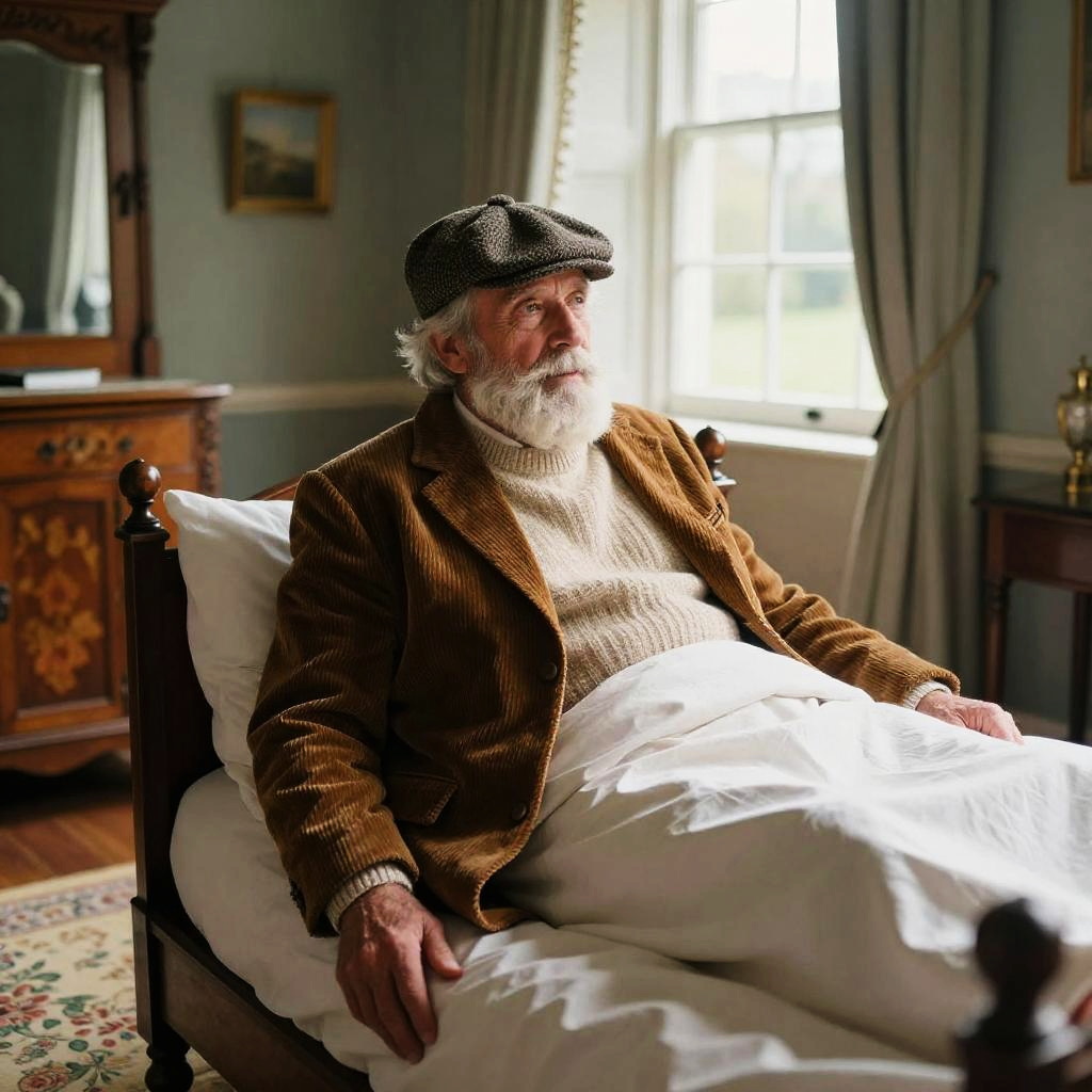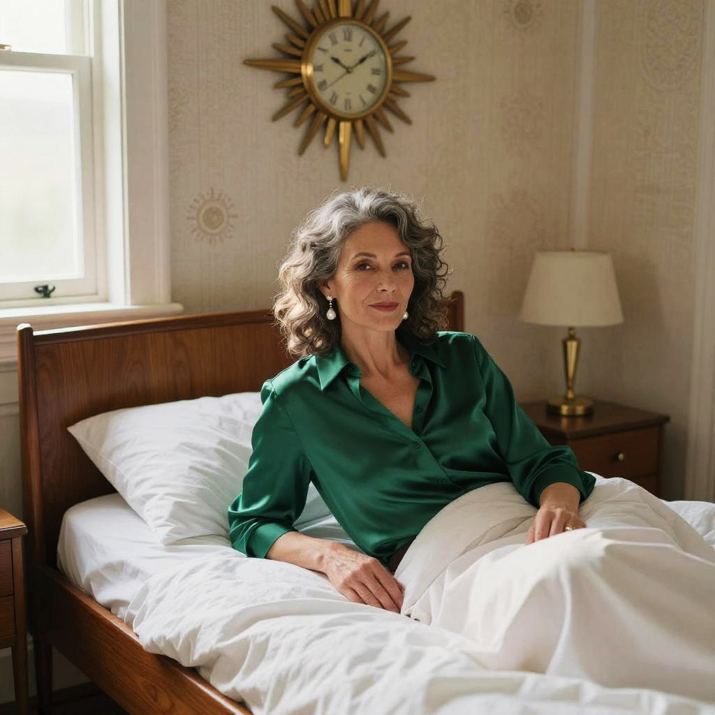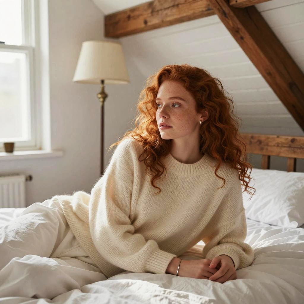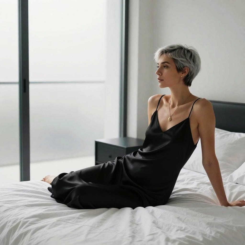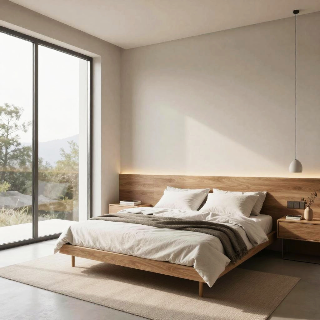 Photograph of an adult man with tousled light brown hair and clean-shaven face, relaxed on a neatly made bed in a minimalist bedroom with white walls, black metal bed frame, and a geometric patterned rug. Wearing navy blue button-up shirt and charcoal trousers. Natural window light brushes across the scene, gentle rim light in the hair, airy atmosphere, editorial lifestyle mood, soft color grading, subtle grain, serene expression, clean composition.