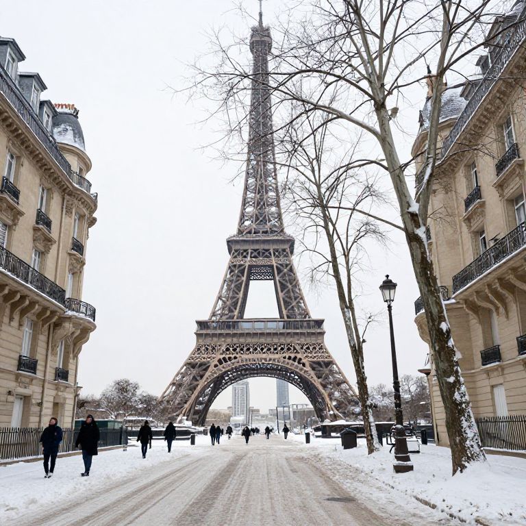 Photograph of the Eiffel Tower in Paris, surrounded by snow-covered ground, leafless trees, and classic buildings on both sides. People walk