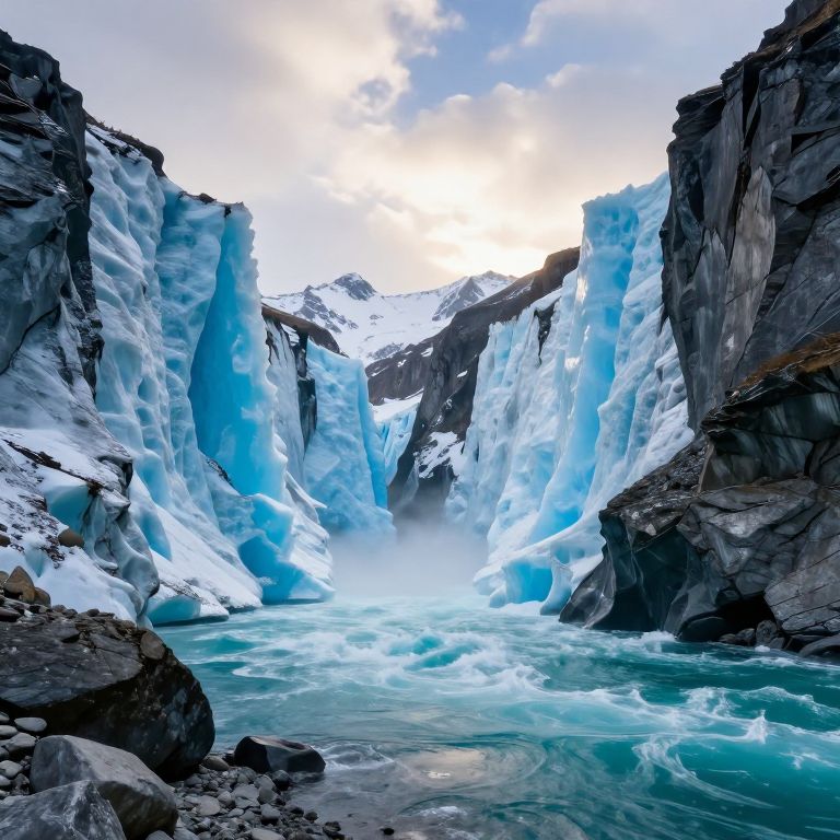 Whispering winds drift through a majestic ice canyon, where towering translucent blue cliffs rise above a turbulent turquoise sea, framed by rugged rocky shores and distant snow-capped peaks under a soft, cloud-dappled sky.
