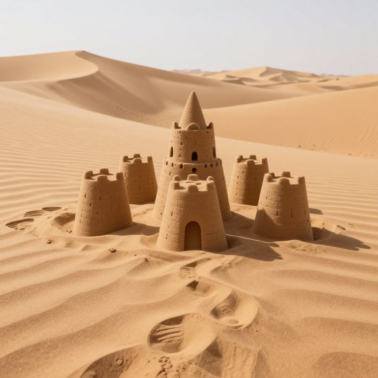 A sentient desert whose grains of sand memorize the footsteps of travelers, replaying their journeys in vivid sandcastles upon the wind.