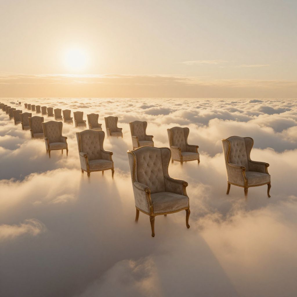 A procession of elegant wingback chairs floats serenely above a sea of golden clouds, defying gravity in a surreal journey toward the horizon.