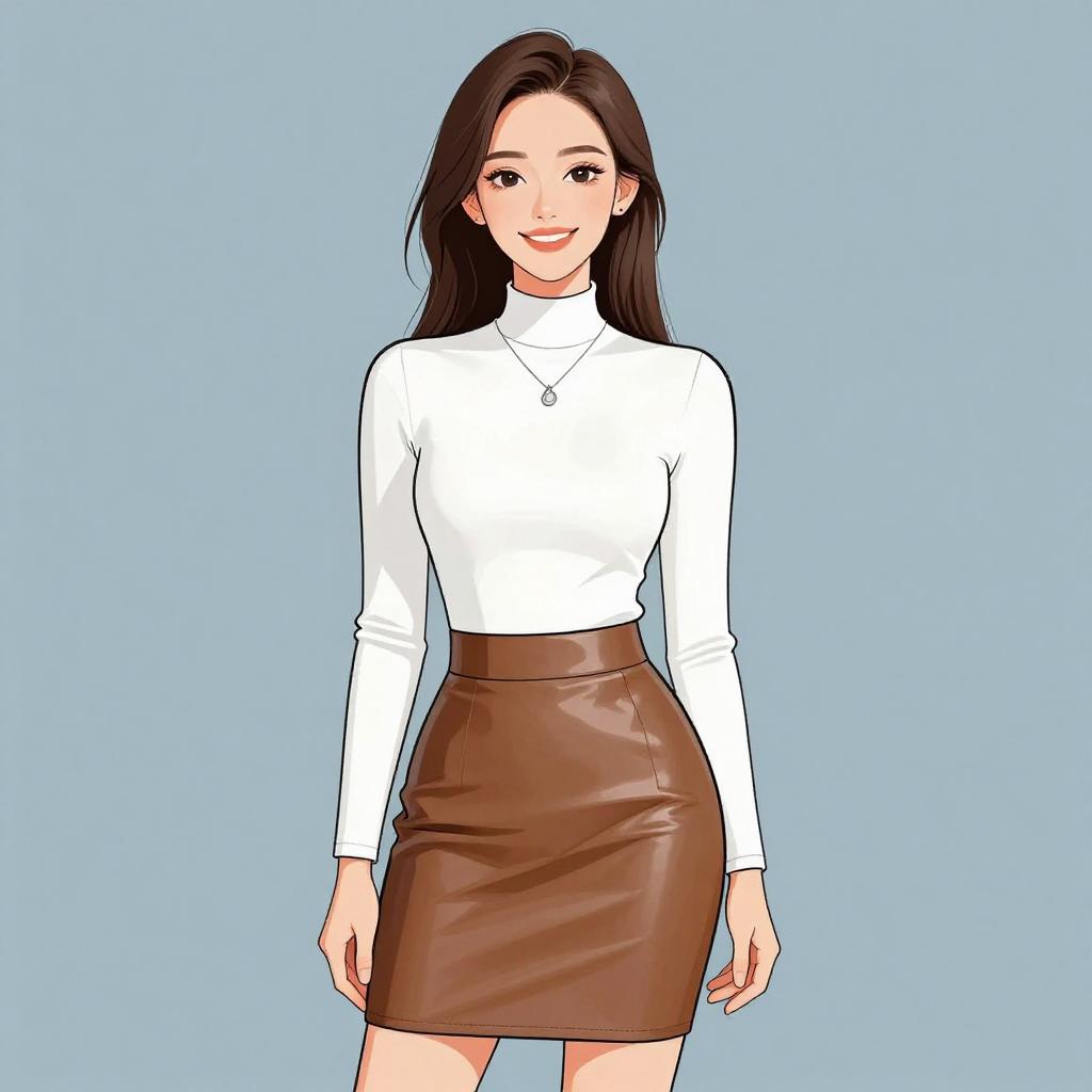 Woman with pretty face and pretty hair. smiling Woman, casual chic, cropped chunky knit sweater in deep purple, high neck, long sleeves, black flared mini skirt, high waist, smooth faux leather material, silver chunky bracelet, white studio background. --sref 1467