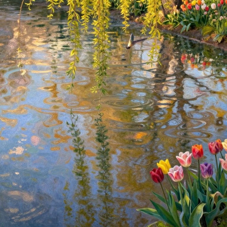 Envision a tranquil pond scene reminiscent of Monet's renowned Water Lilies series, where a body of water is harmoniously surrounded by verdant foliage and blossoming lotus flowers. The ambiance exudes the warmth of summer through an array of soothing colors and delicate brushstrokes that seamlessly merge the water, vegetation, and sky. This aerial perspective, akin to observing from a hovering insect's viewpoint, highlights nature's intricate details while preserving the intimate relationship between the aquatic environment, flora, and fauna. This expansive image should instill a sense of serenity and calmness, inviting viewers to lose themselves in the serene beauty of nature, creating an atmosphere that transports them into an enchanting, dreamlike landscape.