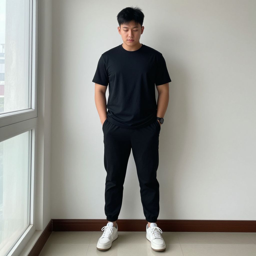 Photograph of an Asian man standing against a white wall beside a large window, bathed in natural light. He has short, black hair and is dressed in a plain black t-shirt and black pants, with white sneakers. His hands are in his pockets, and he wears a black wristwatch on his left wrist. The floor is light gray, and the baseboard is dark brown. The man's expression is neutral, and he gazes downward. The overall style is minimalist and modern.