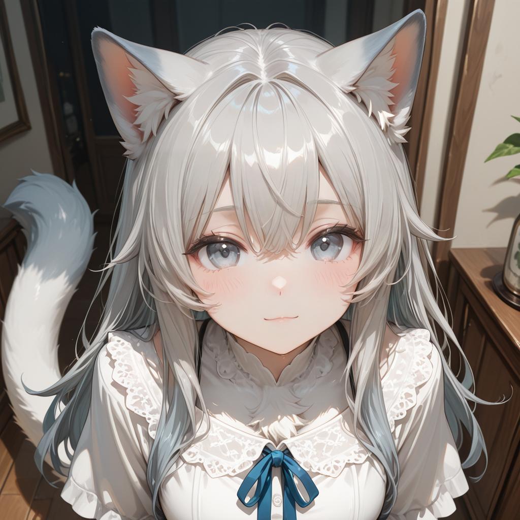 (hi res), ((masterpiece)), ((best quality)), illustration, furry, cat, animal ears, tail, bodyfur, 1girl, POV, upper body, solo, long hair, gray hair, *//*, blue eye, white blouse, looking at viewer, smile