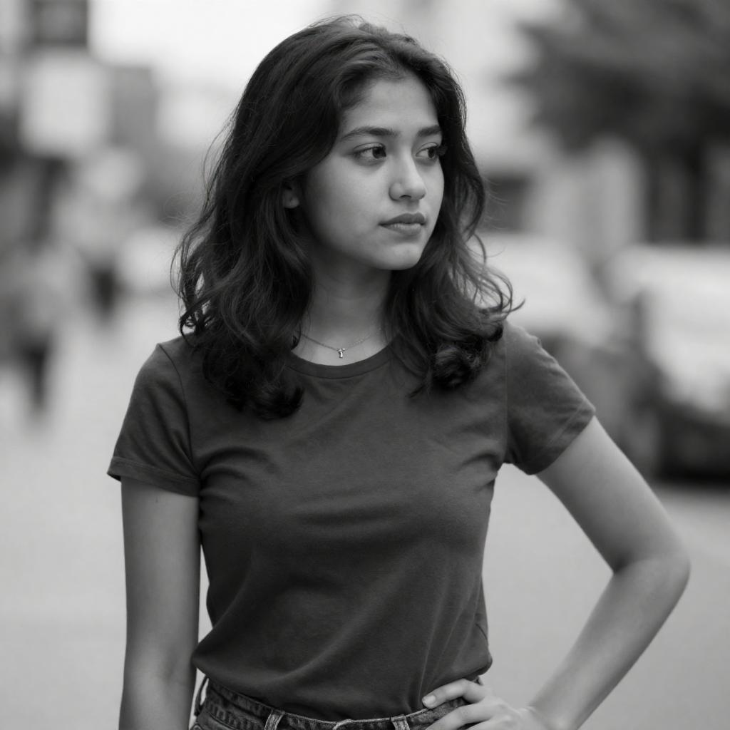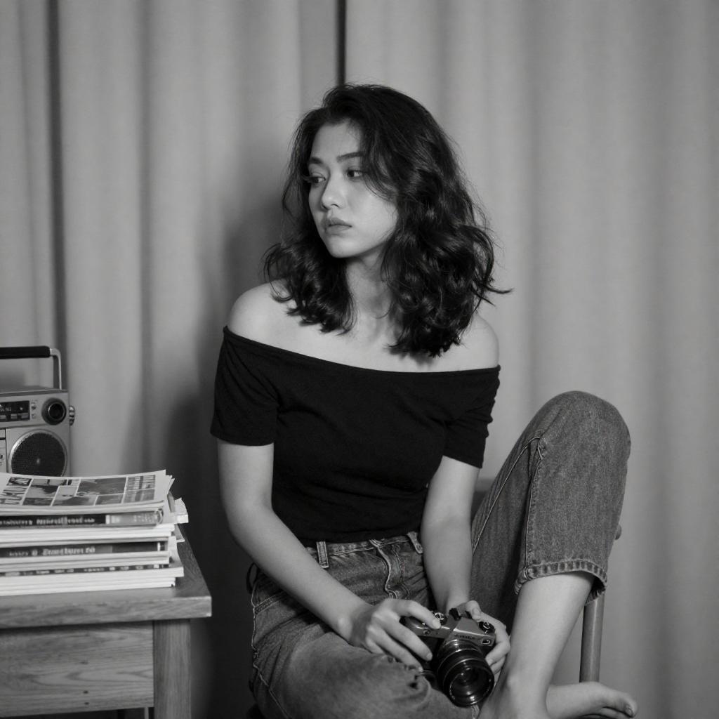 Black-and-white photograph of a young woman with wavy, shoulder-length dark hair, wearing a black off-shoulder top, sitting on a chair beside a cluttered wooden table with stacked magazines and a radio. She holds a camera, looking slightly to the side with a contemplative expression. The background features vertical curtains.
