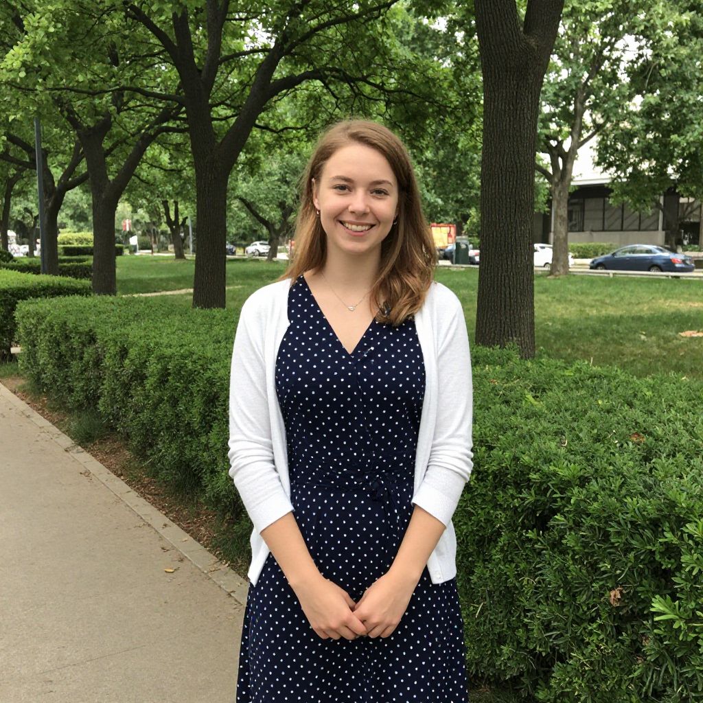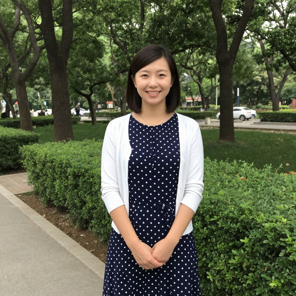 Photograph of a smiling Asian woman with straight black hair, wearing a white long-sleeve shirt under a navy blue polka dot dress, standing