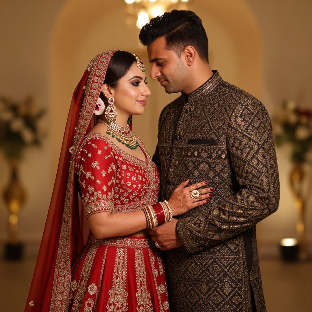 Elegantly dressed couple sharing a tender moment, with the woman adorned in a vibrant red lehenga and intricate jewelry, while the man wears a dark, patterned sherwani with gold embellishments, set against a warm, bokeh-lit backdrop.