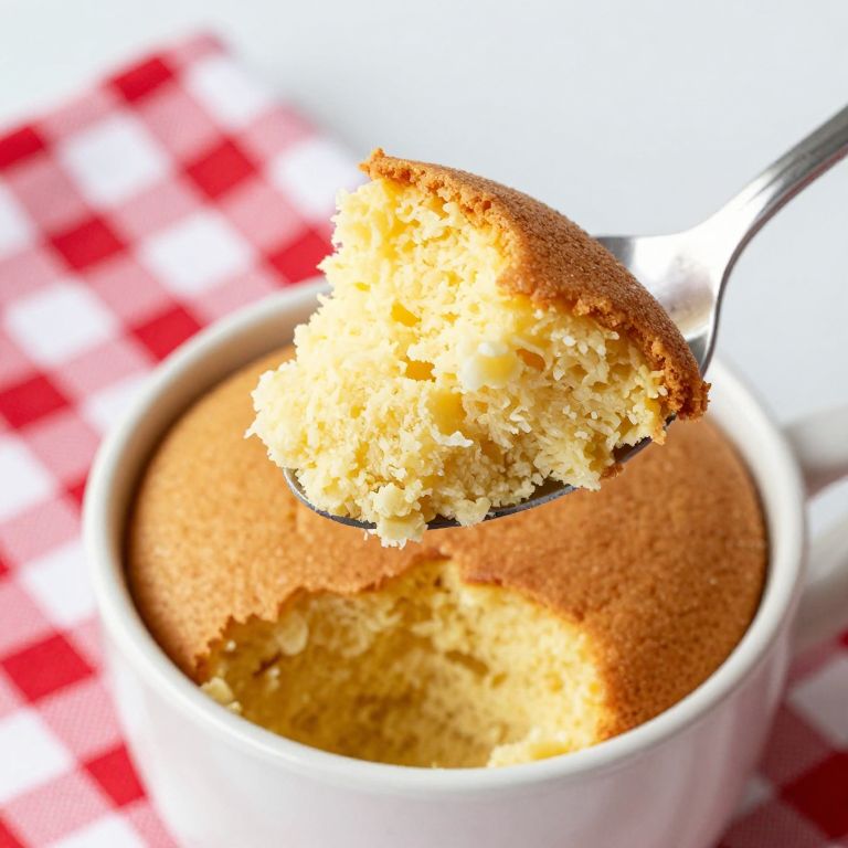 Scoop of golden-brown microwave mug cake being lifted by a spoon, showcasing its moist texture against the backdrop of a white ceramic mug and a red-and-white checkered cloth.