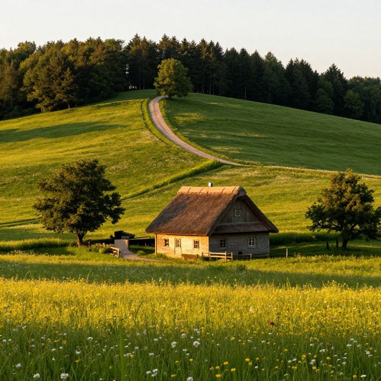 Malte shown as an idyllic countryside landscape, rolling hills dotted with wildflowers, a small rustic farmhouse with a thatched roof, a winding dirt road leading to a dense forest, golden hour light creating long warm shadows, realistic style