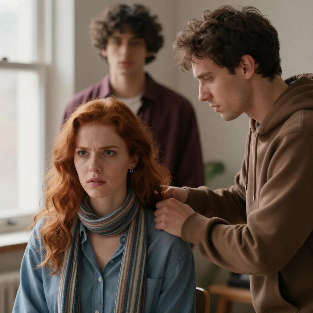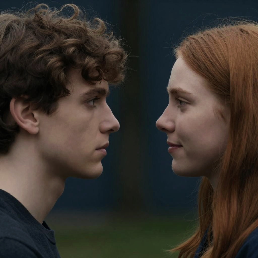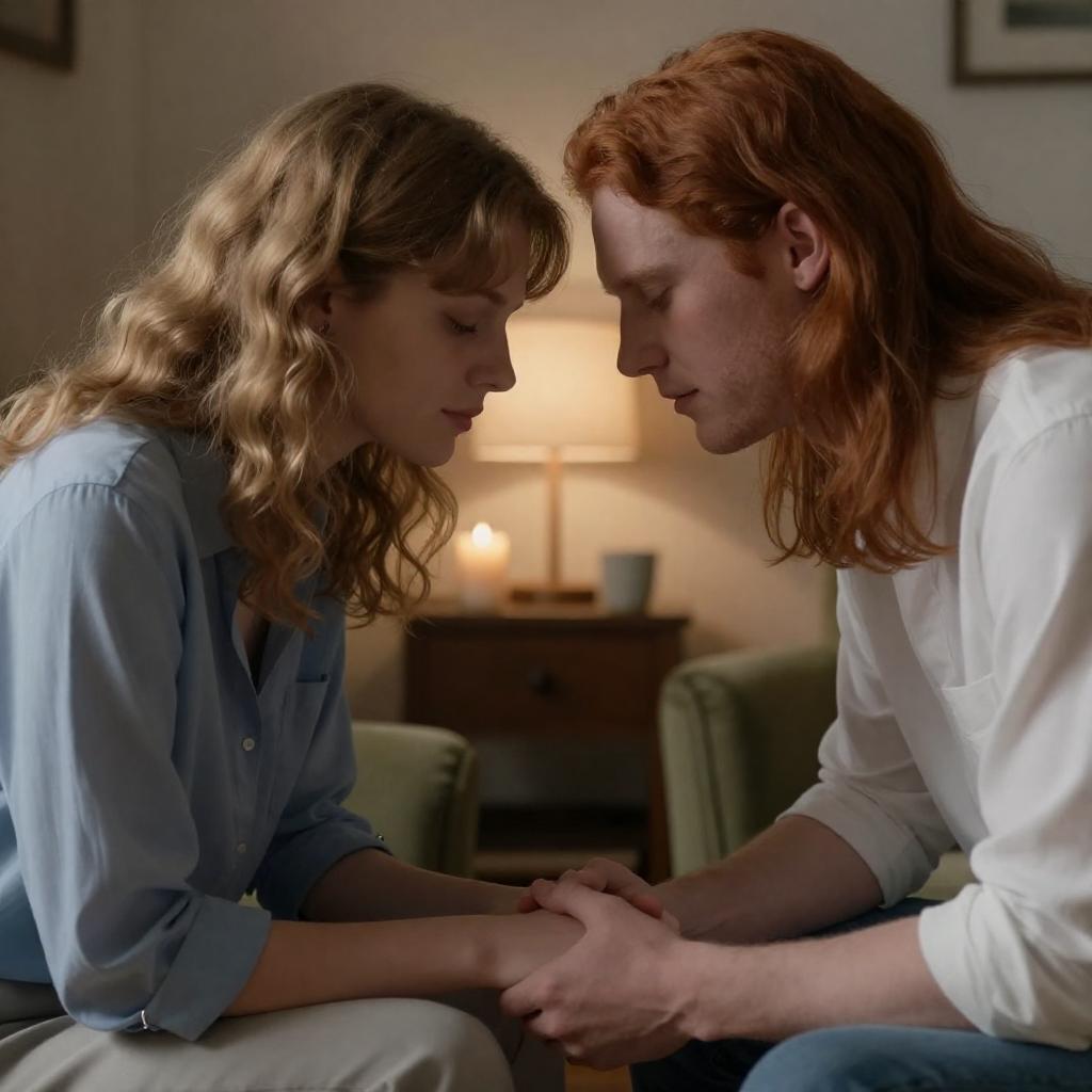 Photograph of two people in a dimly lit room. A woman with wavy, blonde hair in a light blue shirt holds hands with a man with long, straight, red hair in a white shirt. They are leaning towards each other, eyes closed. Background includes a lit lamp, candles, and a green armchair. Woman's left hand is on man's right hand. Man's right hand is on woman's left hand. Intimate, emotional interaction.