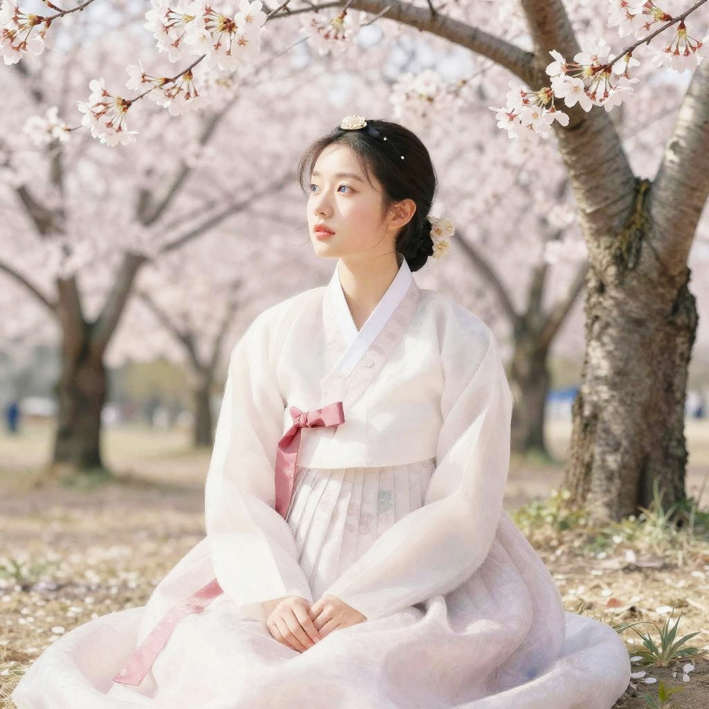 Korean with blue eyes, traditional hanbok dress, serene expression, sitting in a blooming cherry blossom garden, soft pastel colors, delicate brush strokes, watercolor style