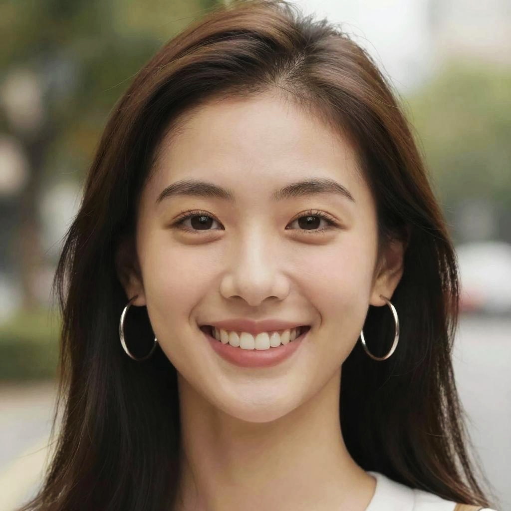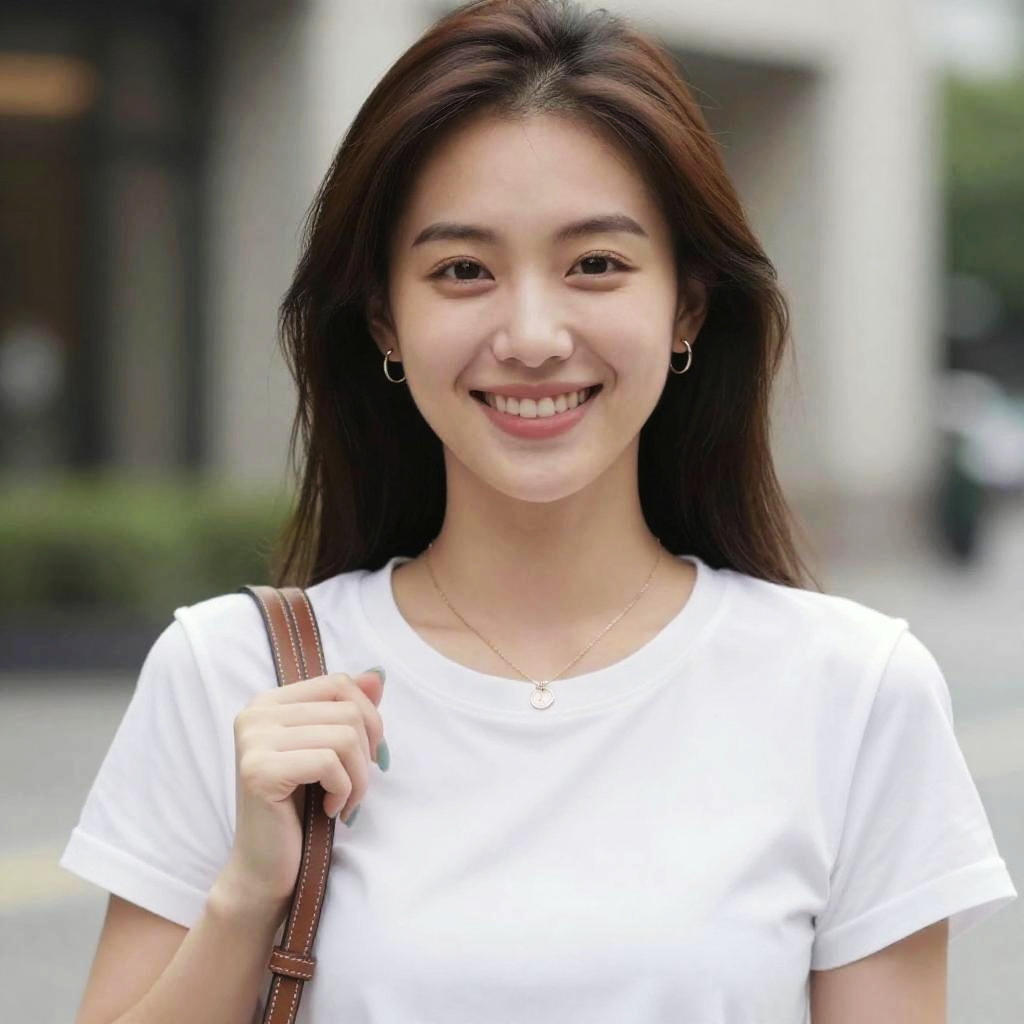 Solo, realistic, 1girl, asian, long hair, smile, bag, earrings, shirt, jewelry, white shirt, looking at viewer, outdoors, brown hair, holding, short sleeves, grin, day, brown eyes, photorealistic, upper body, nail polish, blurry, green nails, blurry background
