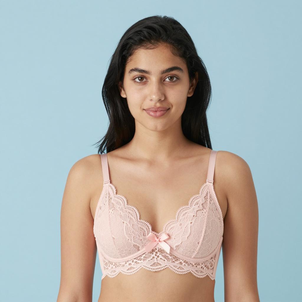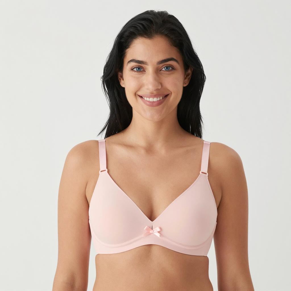 Portrait of a young woman standing indoors wearing a light pink sleeveless tank top and salmon pink athletic shorts. She has medium-length dark brown hair and a neutral expression, set against a soft peach-colored wall background with white door frames.