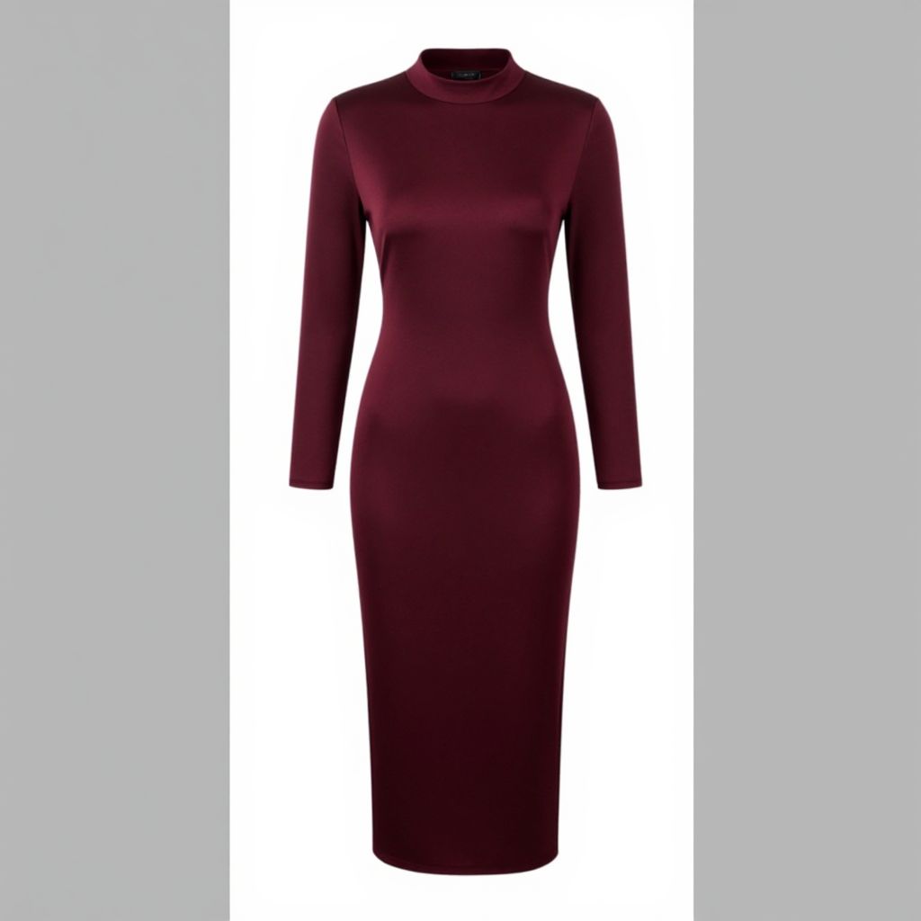 Photograph of a sleek, form-fitting, long-sleeve, deep burgundy dress with a high neckline and no visible embellishments. The dress has a straight silhouette and falls to mid-calf length. It's centered against a plain white background with gray borders on either side, highlighting the dress's elegant and simple design. The fabric appears to be smooth and slightly glossy.