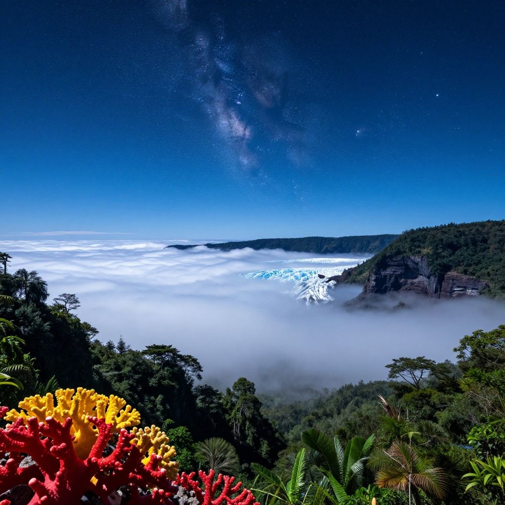 Big island, a mesmerizing scenery of clouds and stars showing a natural landscape, celestial objects in a beautiful sky, shooting stars, trees, glacier, rainforest, snow, jungle, cliff, night, the most beautiful image in the world, <8k, high detail, uhd, sharp focus, palette, photorealistic, absurdres, extreme detail, as much detail as possible>, shiny coral, bright yellow, shiny azure, matte blue, bright red