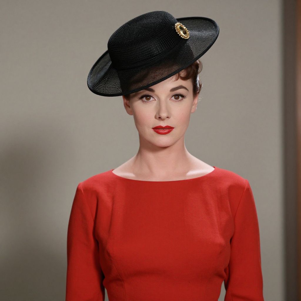 Photograph of a fair-skinned woman with red lipstick, wearing a red, long-sleeve dress and a black, textured, wide-brimmed hat with a gold embellishment. She has dark, wavy hair tucked under the hat. The background is a plain, light gray, which contrasts with her vivid red dress and black hat. She gazes directly at the camera with a calm, composed expression. The image has a vintage, pin-up style.