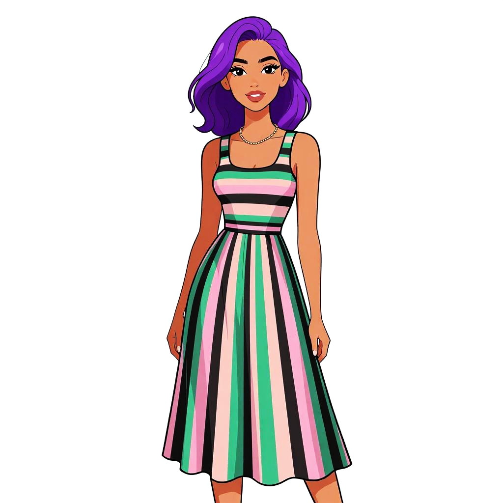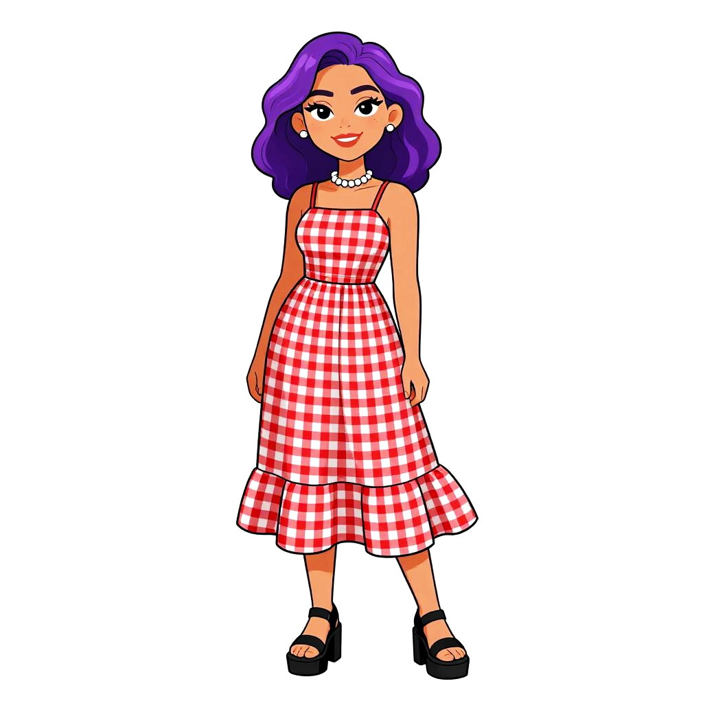 Woman with pretty face and pretty hair. smiling Woman, casual summer, midi sundress in red and white gingham, spaghetti straps, straight neckline, slightly cinched waist, flowing skirt with flounce hem, black platform sandals with thick straps, pearl choker necklace, plain white studio background. --sref 1467