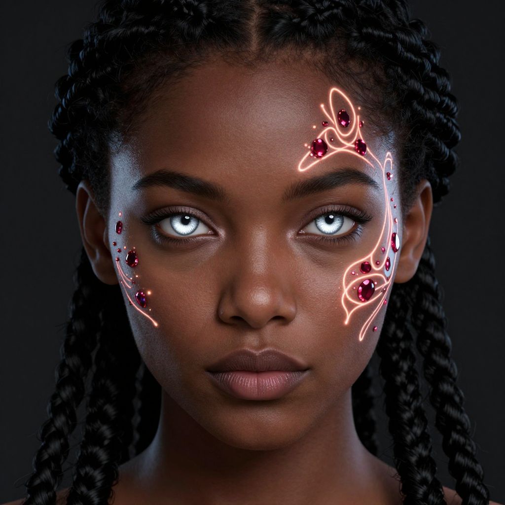 Photograph of a dark-skinned woman with glowing blue eyes, intricate neon and red light patterns on her right cheek, and braided hair against a