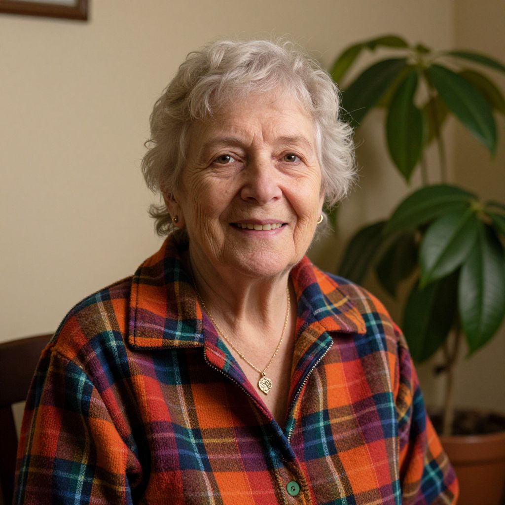 Photograph of an elderly woman with short, curly white hair and light skin, smiling warmly at the camera. She wears a vibrant, multicolored plaid shirt with orange, red, blue, and green stripes, and a small gold necklace with a heart-shaped pendant. Her wrinkles and gentle smile convey a sense of warmth and wisdom. In the background, there is a green potted plant with large leaves and a beige wall. The lighting is soft, highlighting her face and the textures of her shirt. The overall mood is cozy and inviting.