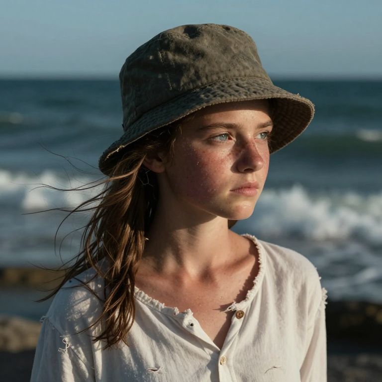 A photorealistic portrait of a wind-swept girl with sun-kissed skin and soft blue eyes exudes both endurance and yearning as her gaze rests upon the horizon. Captured in a three-quarter view from above, the coarse texture of her fisherman's hat and tattered white shirt hint at the muscular build beneath. Employing chiaroscuro lighting, deep shadows accentuate her weathered face while the interplay of light on ocean waves behind creates an evocative atmosphere, balancing solitude with introspection.