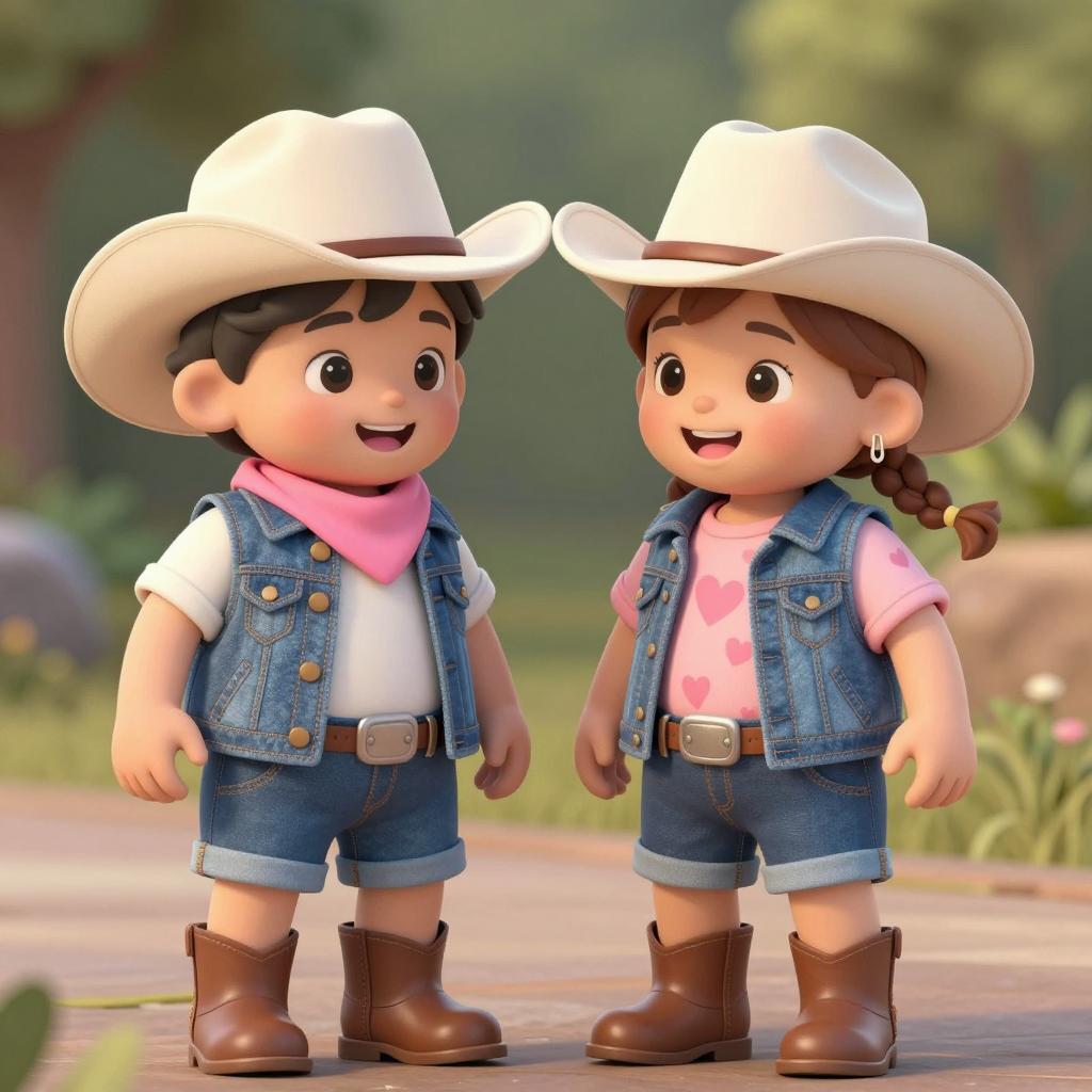 Illustration of three people in western attire featuring two men wearing black cowboy hats and a woman with curly brown hair in a red dress and brown cowboy hat. One man has a neutral expression, the other is smiling. Background includes oil rigs, an old truck, and distant structures, rendered in a soft, watercolor style.