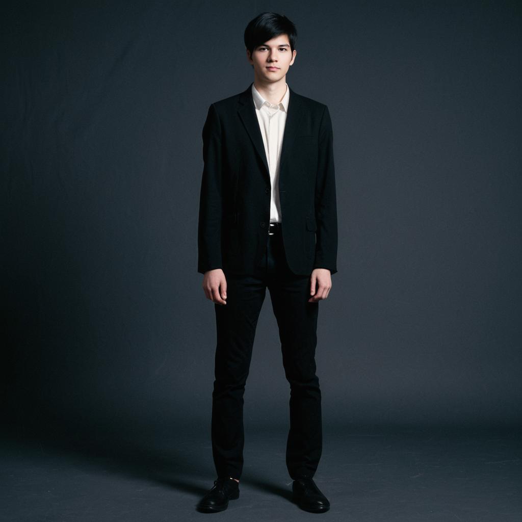 Self cosplay, Joy Division Kevin Cummins, slim pale male, black fitted blazer and shirt, short dark hair, minimalist 1980s indie fashion style, full body shot, studio background