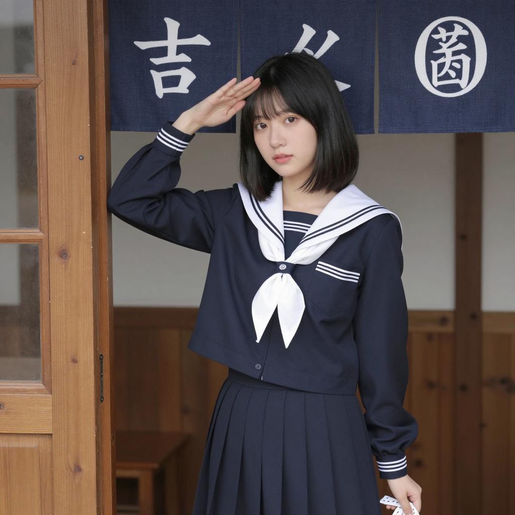 Asian woman with medium-length black hair wearing a navy blue sailor-style school uniform with a white bow, standing in a wooden doorway. She raises her right hand to her forehead, left hand holding a white patterned ribbon. Background includes wooden walls and blue fabric with white symbols. Photograph.