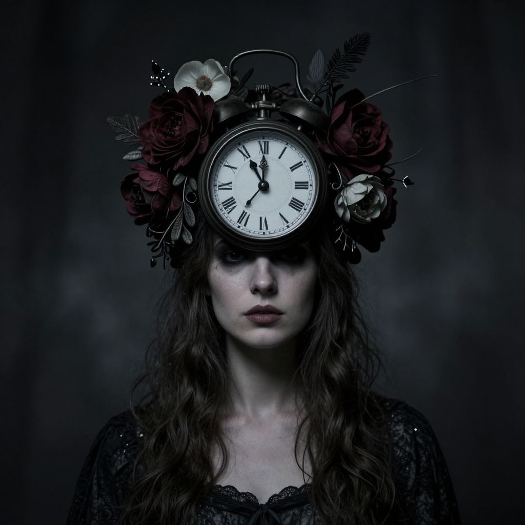 A haunting, dark, and eerie portrait of a woman adorned with a clock and floral headpiece, set against a bleak, ominous background, reminiscent of Memento Mori by Bastien Lecouffe Deharme.