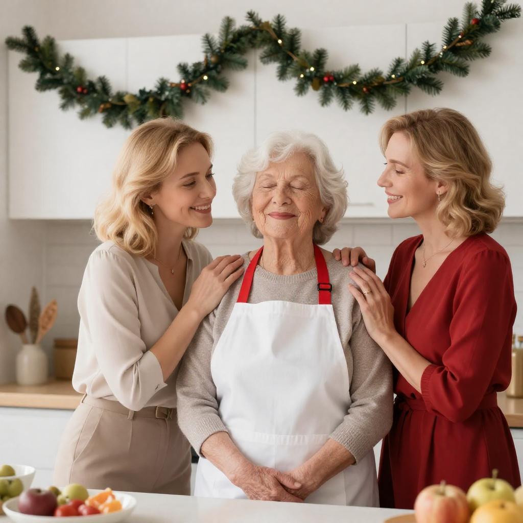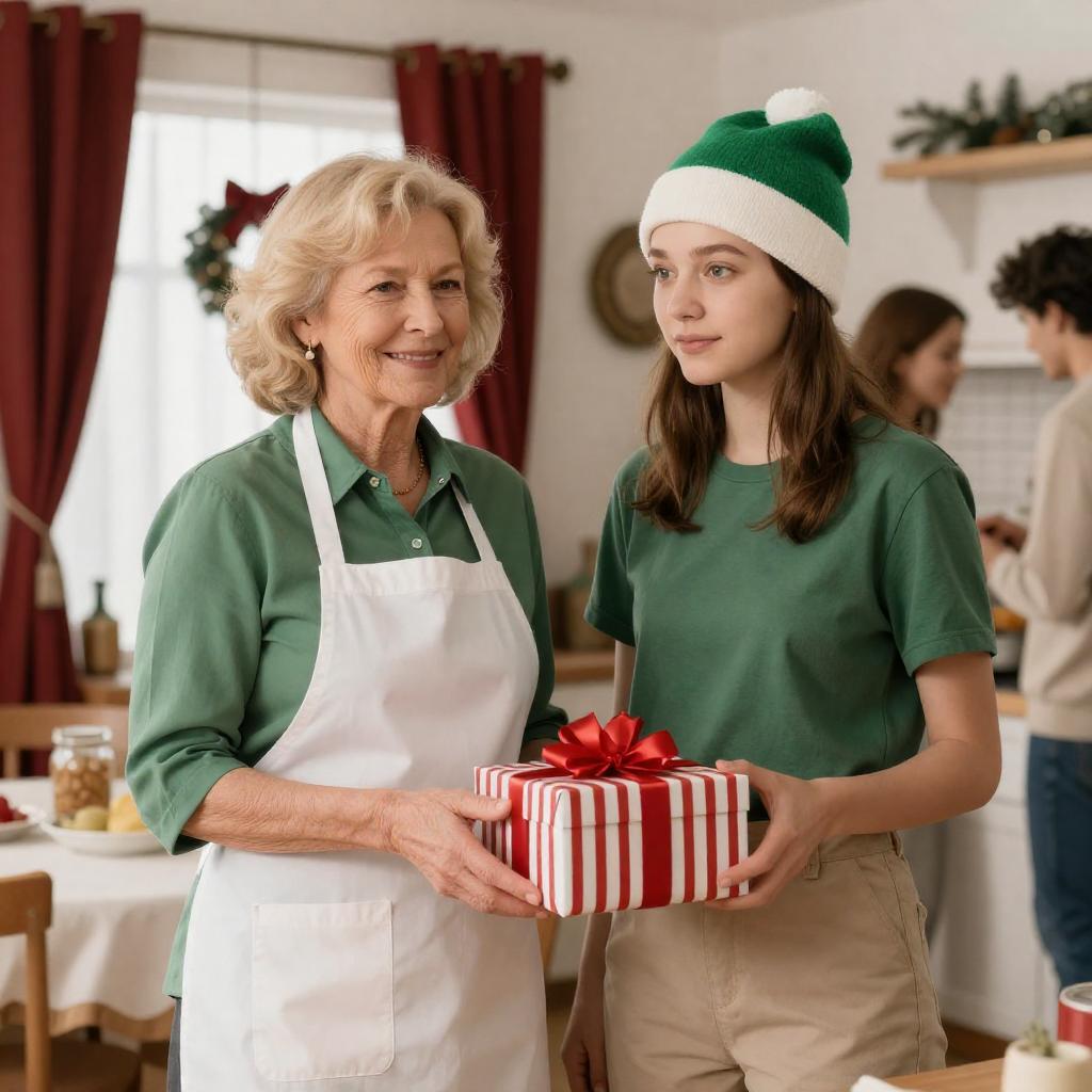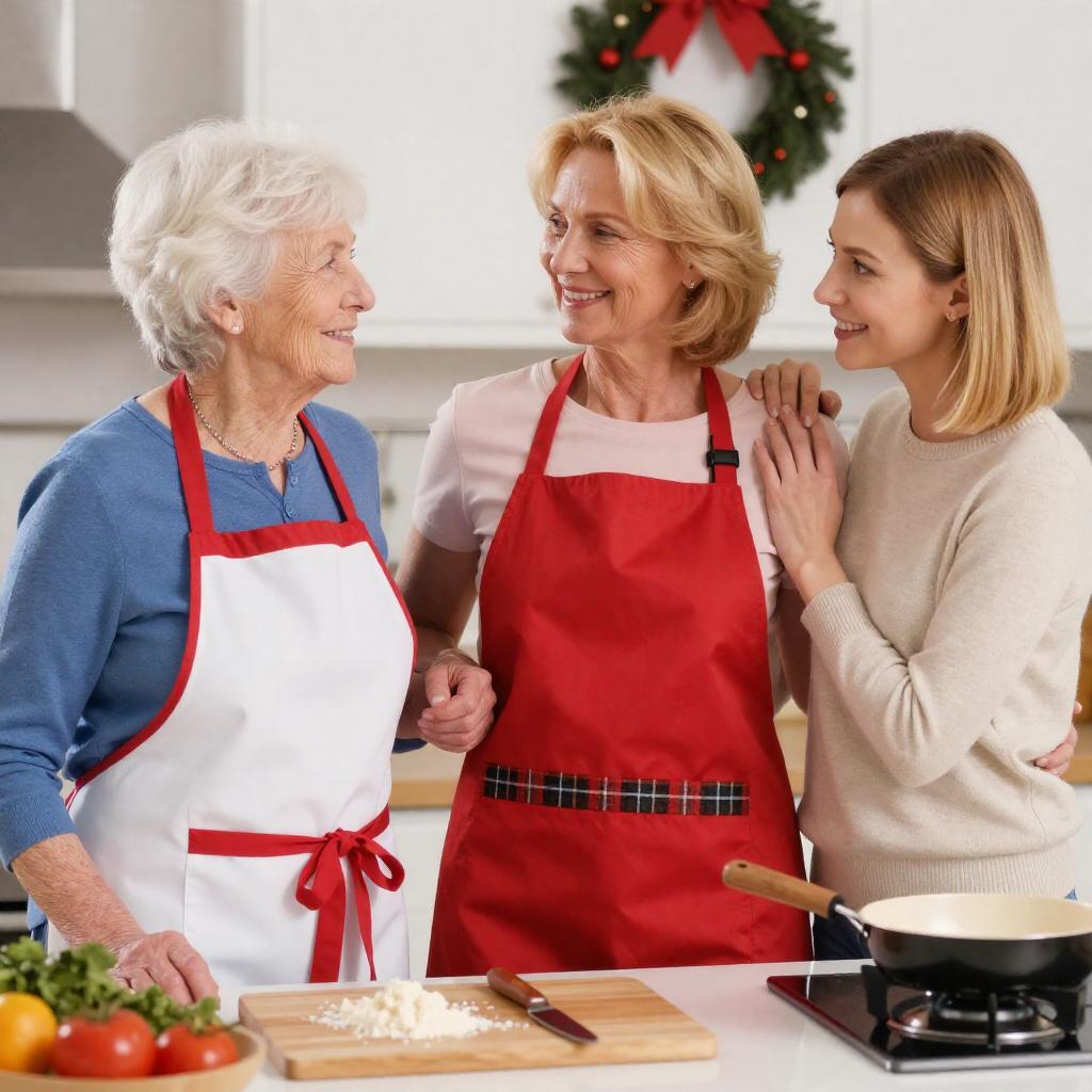 Photograph of a cozy living room. A middle-aged woman with blonde hair and a blue sweater sits at a red table, laughing while a teenage girl in a red sweater with white patterns and a teenage boy in a striped sweater prepare food. Other adults in the background are engaged in conversation. The table is decorated with red flowers and gold garland.