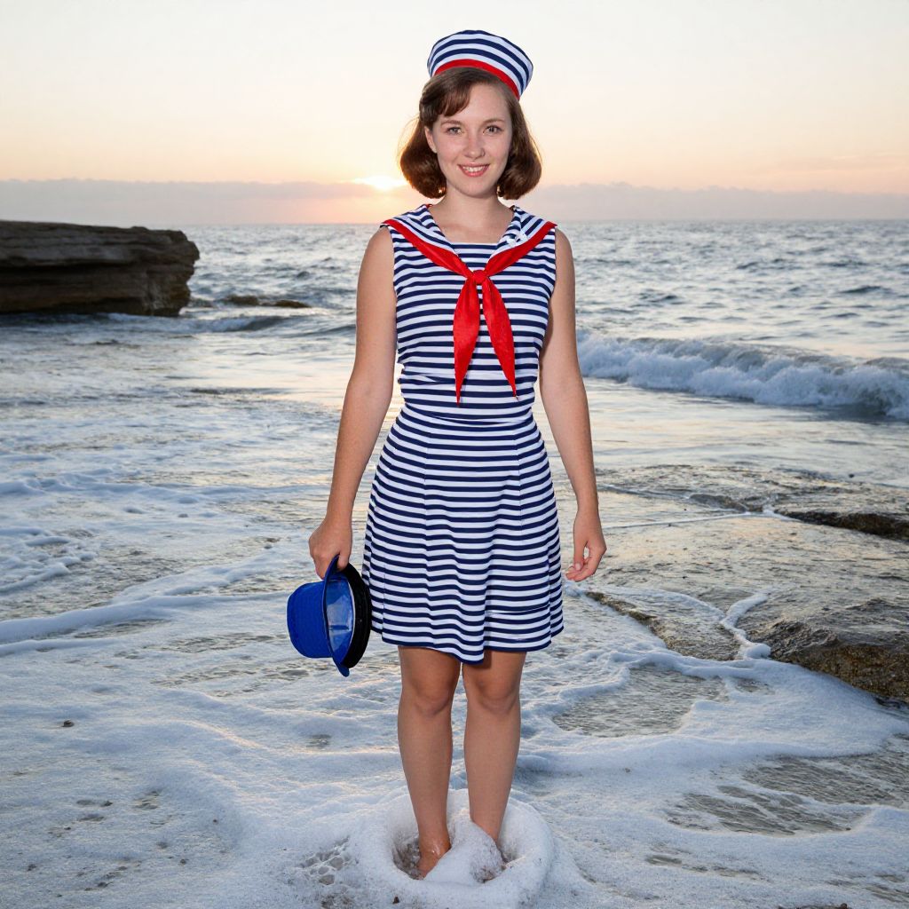 Photograph of a smiling woman in a striped sailor dress with red bow, matching hat, and blue hat, standing in ocean waves at sunset.