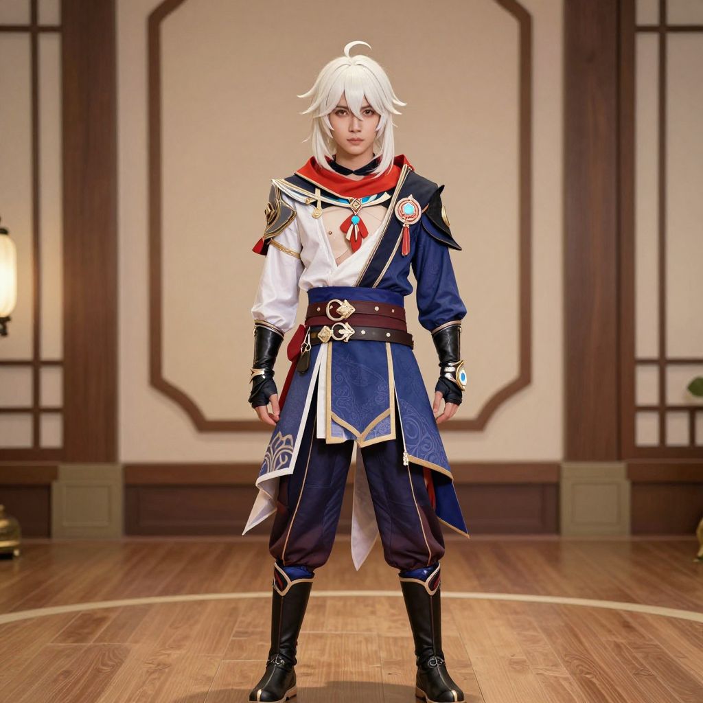 Photograph of a cosplayer with white, shoulder-length hair, wearing a detailed, fantasy-style outfit. The costume features a white long-sleeve shirt with red and blue accents, a navy blue cape, and dark blue pants with white trim. The character has black gloves, a brown belt with a circular buckle, and black boots. The background shows a wooden-floored room with beige walls and brown trim, creating a traditional, elegant atmosphere. The cosplayer stands confidently in the center, with a serious expression, highlighting the intricate design and color contrast of the costume.