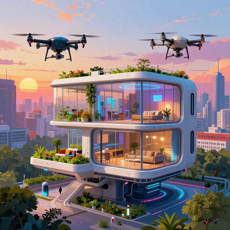 Digital illustration of a futuristic, glass-walled, floating house with rooftop garden, surrounded by drones, cityscape at sunset, and neon-lit street