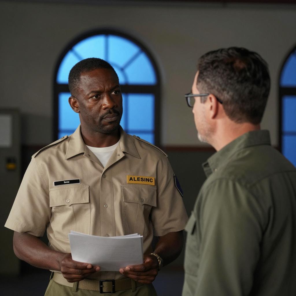 Two men in a dimly lit, industrial setting. Black man with short hair, wearing beige military-style shirt with name tag, holding papers. Light-skinned man with glasses, green shirt, facing him. Background has arched doorway and blue light. Black man's expression is serious, light-skinned man looks up at him. Both standing, focused on each other.