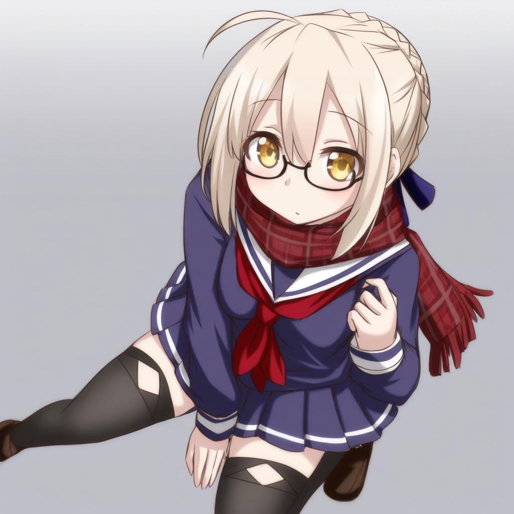 Mysterious heroine x alter (first ascension) (fate), fate (series), 1girl, yellow eyes, hair between eyes, glasses, black-framed eyewear, under-rim eyewear, blonde hair, short hair, ahoge, sidelocks, braid, french braid, serafuku, red scarf, plaid scarf, blue skirt, pleated skirt, black thighhighs, long sleeves, by artist tori (minamopa), leet